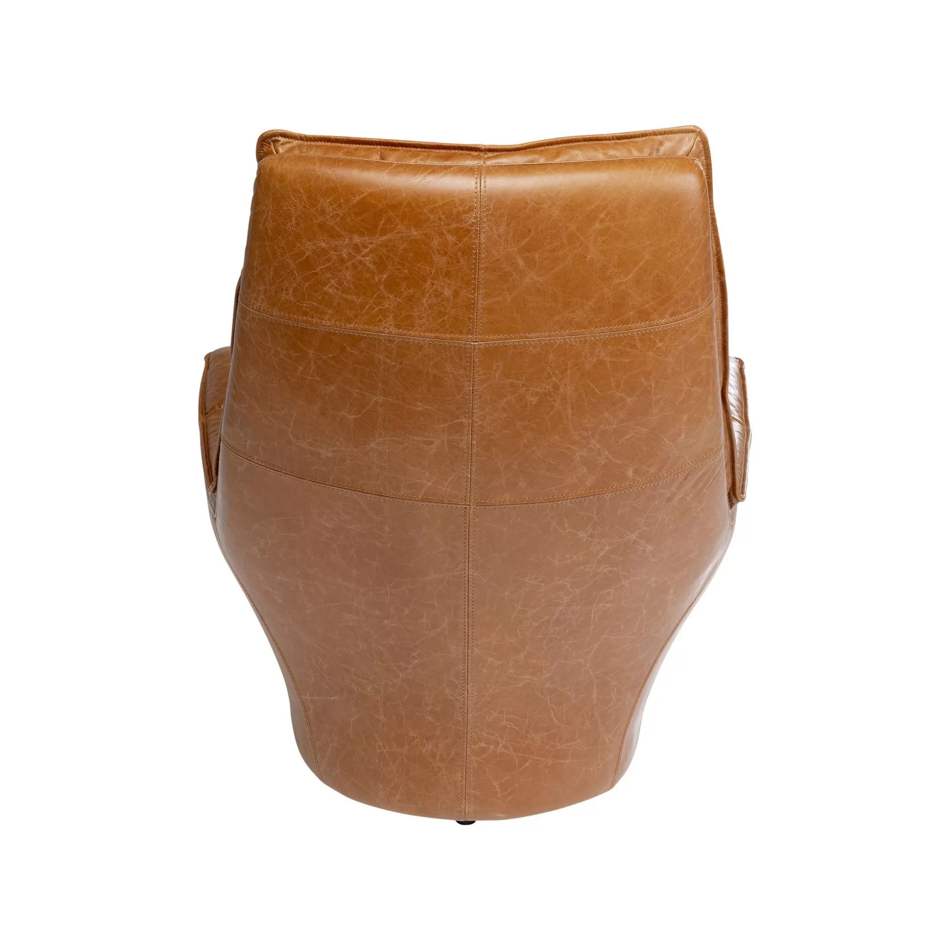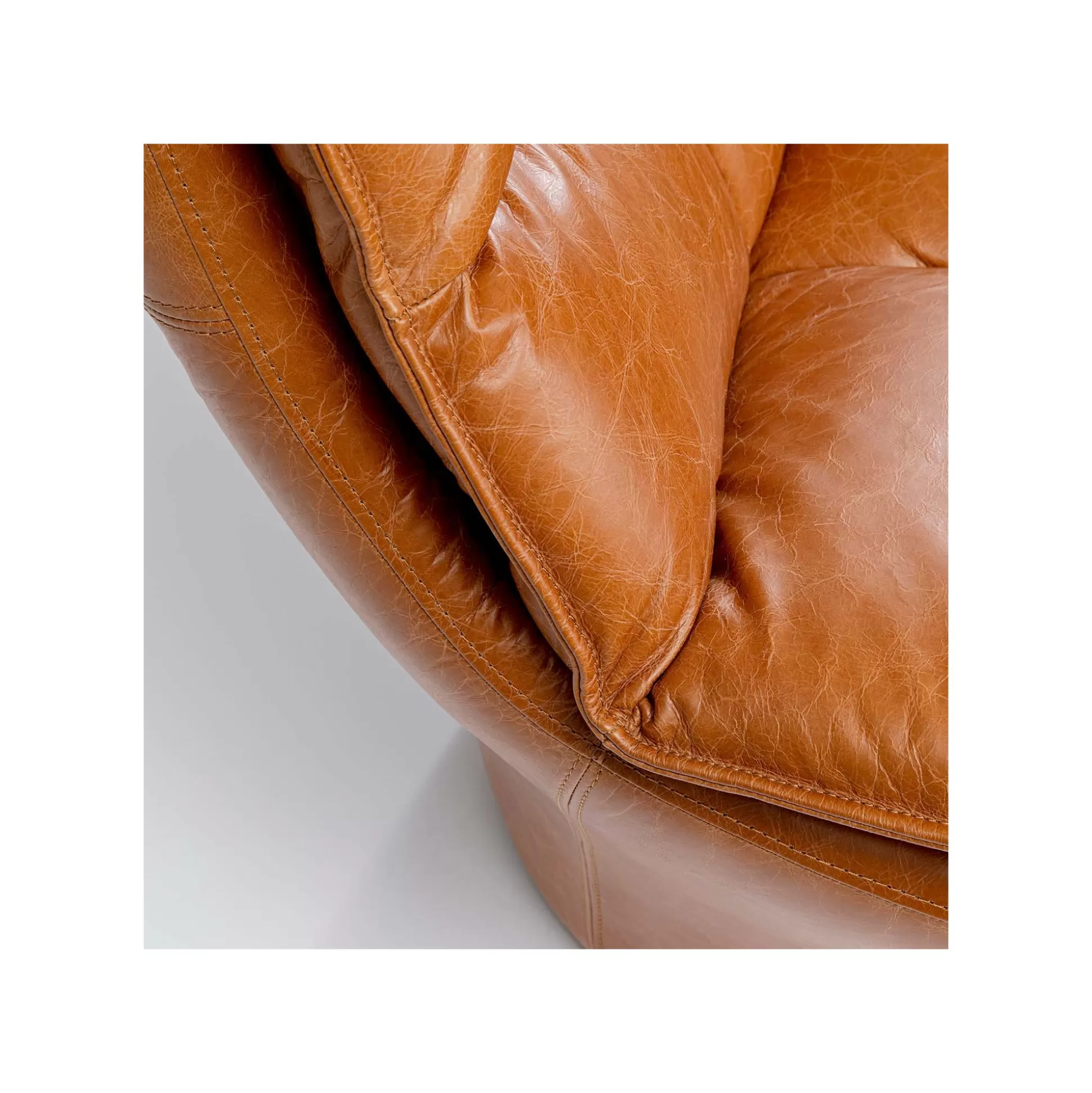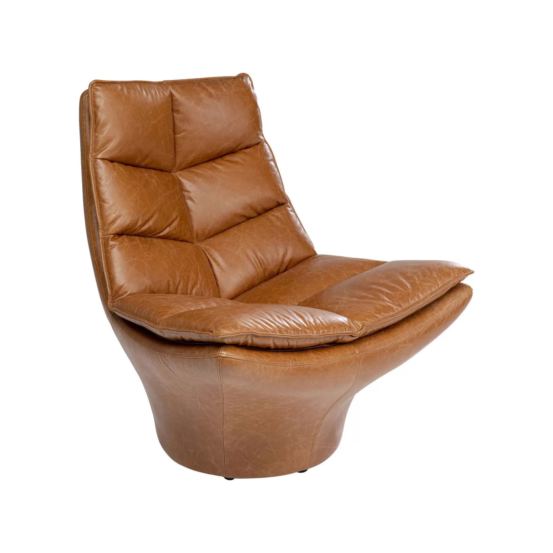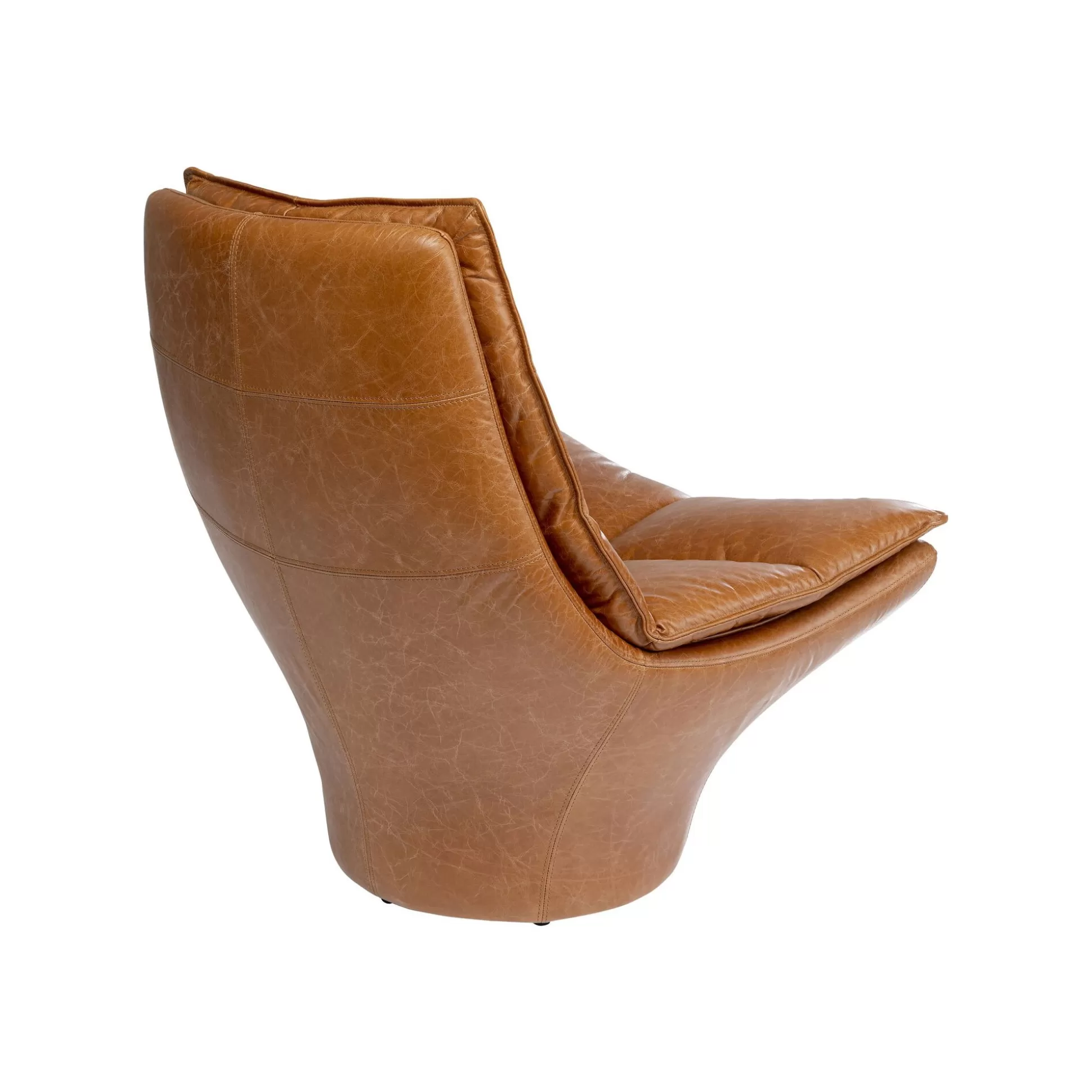 Ce fauteuil en cuir se démarque avec sa forme hexagonale : le dossier et le piétement se rejoignent en une assise plus large. Sa silhouette atypique, ses coutures apparentes et son matelassage en font un trône vintage dans votre pièce.