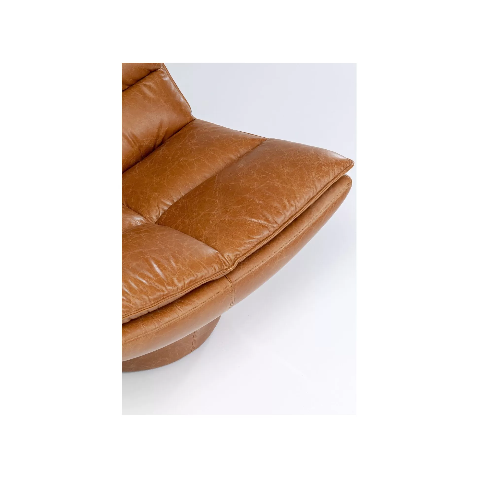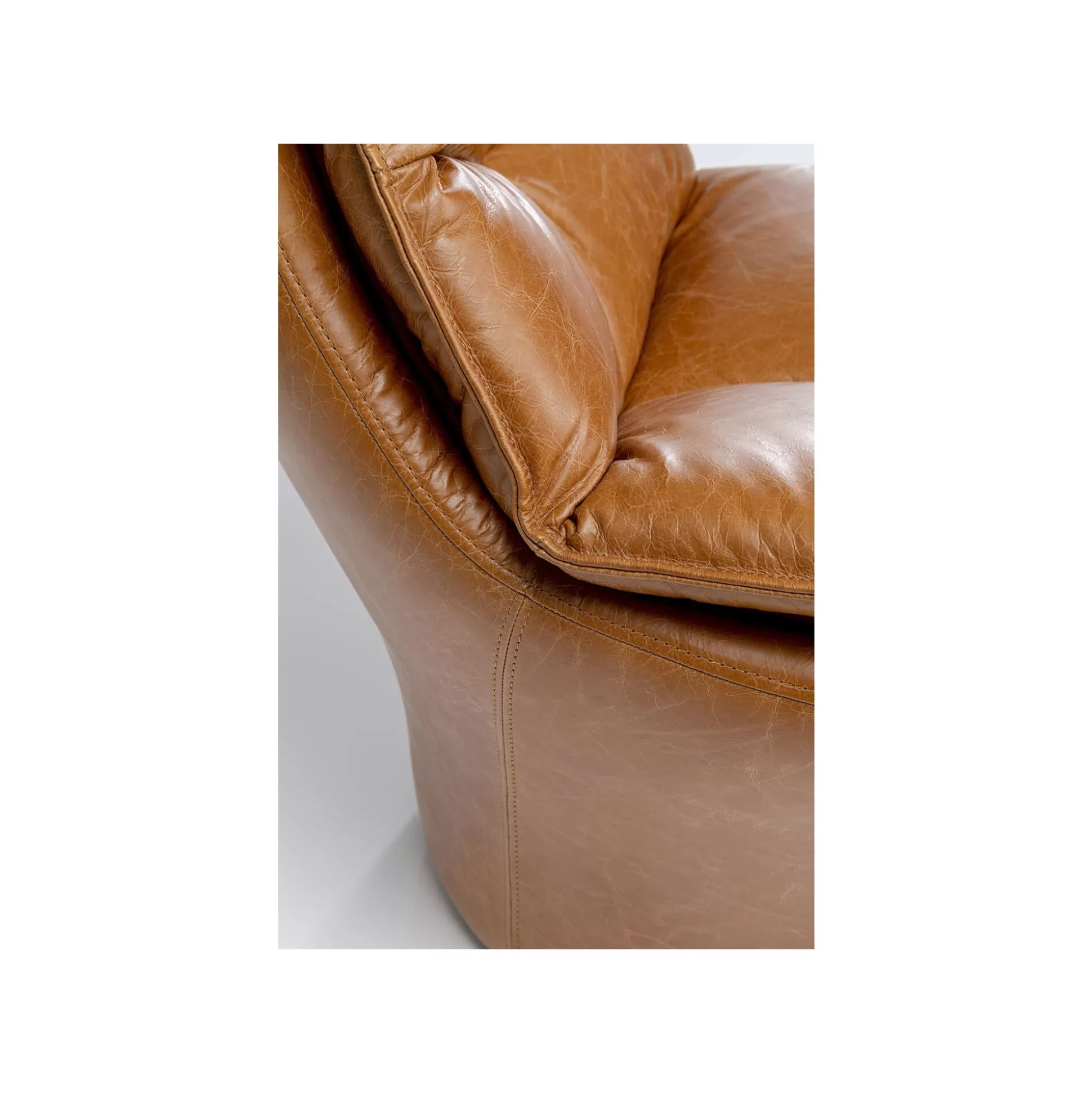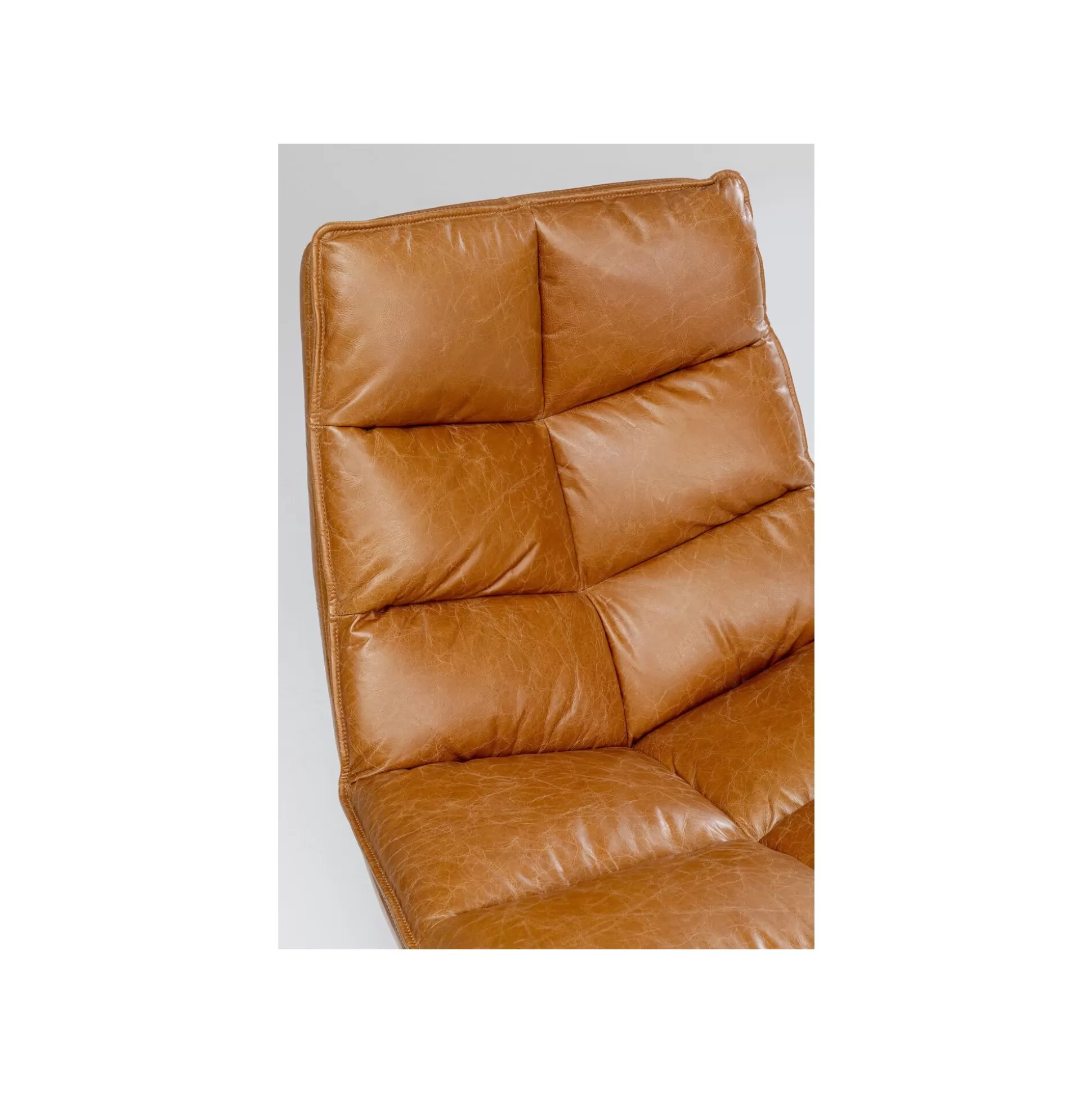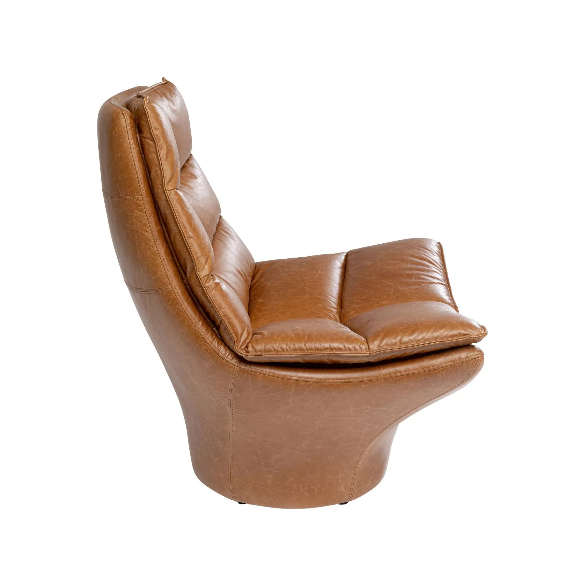 Ce fauteuil en cuir se démarque avec sa forme hexagonale : le dossier et le piétement se rejoignent en une assise plus large. Sa silhouette atypique, ses coutures apparentes et son matelassage en font un trône vintage dans votre pièce.