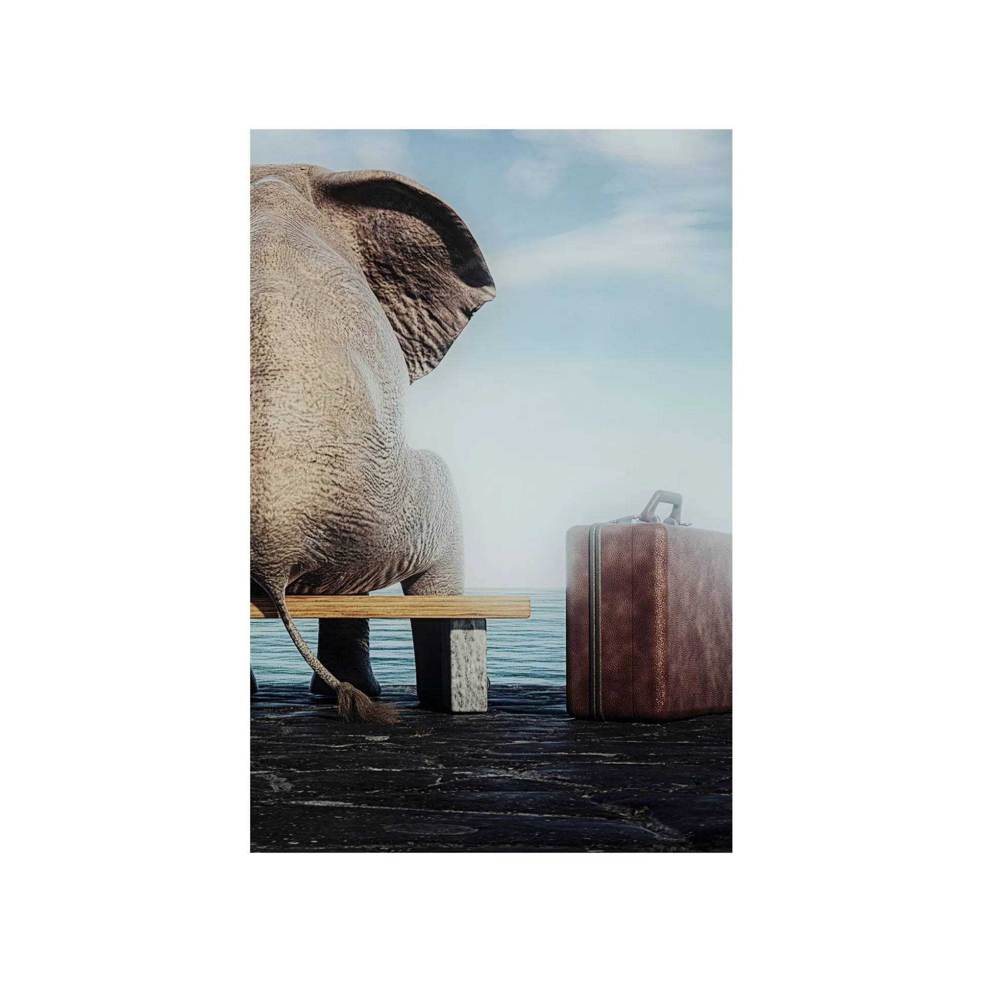 Cet éléphant assis sur un banc, avec sa valise posée au sol à côté de lui, contemple la mer devant lui.