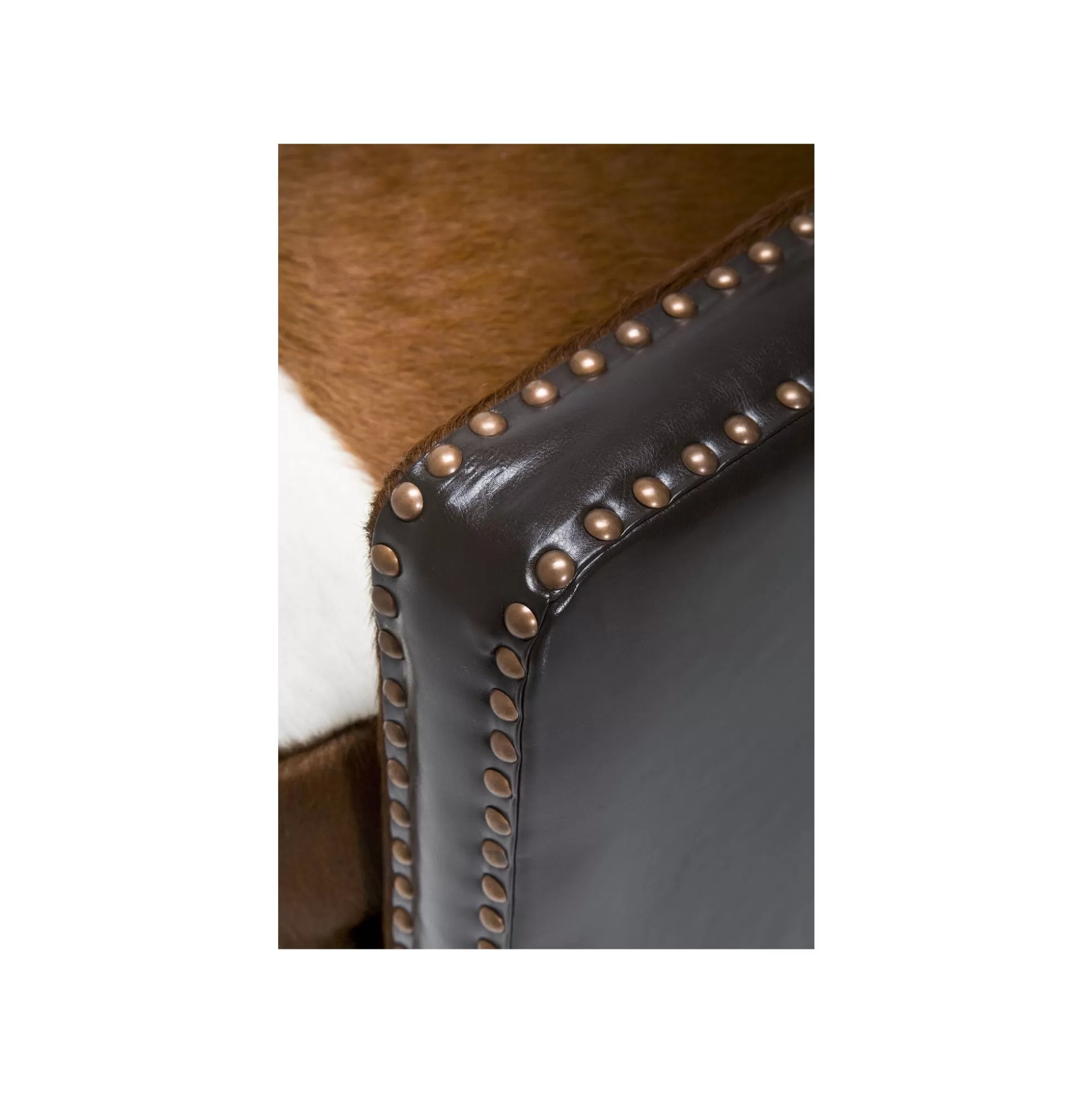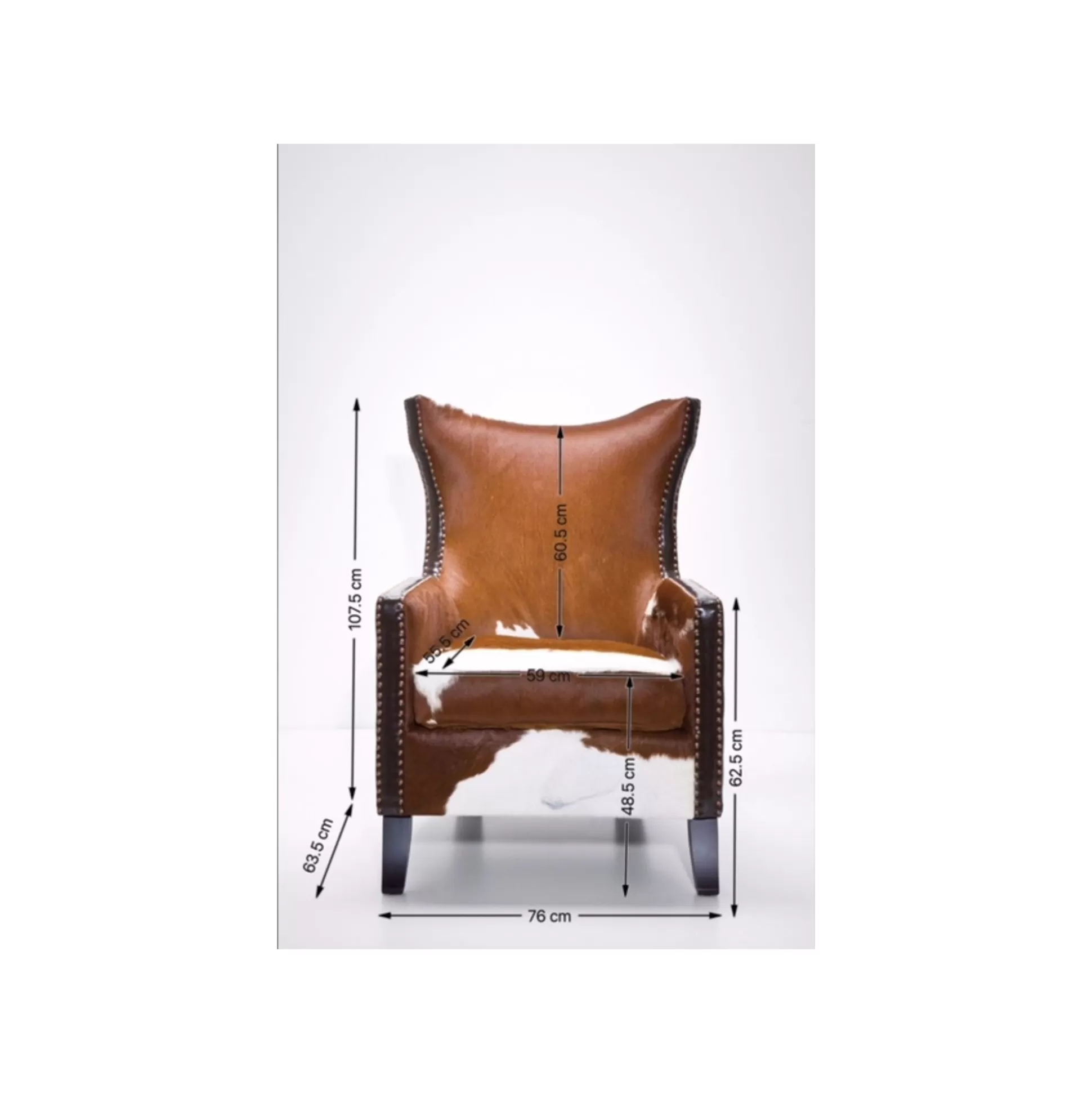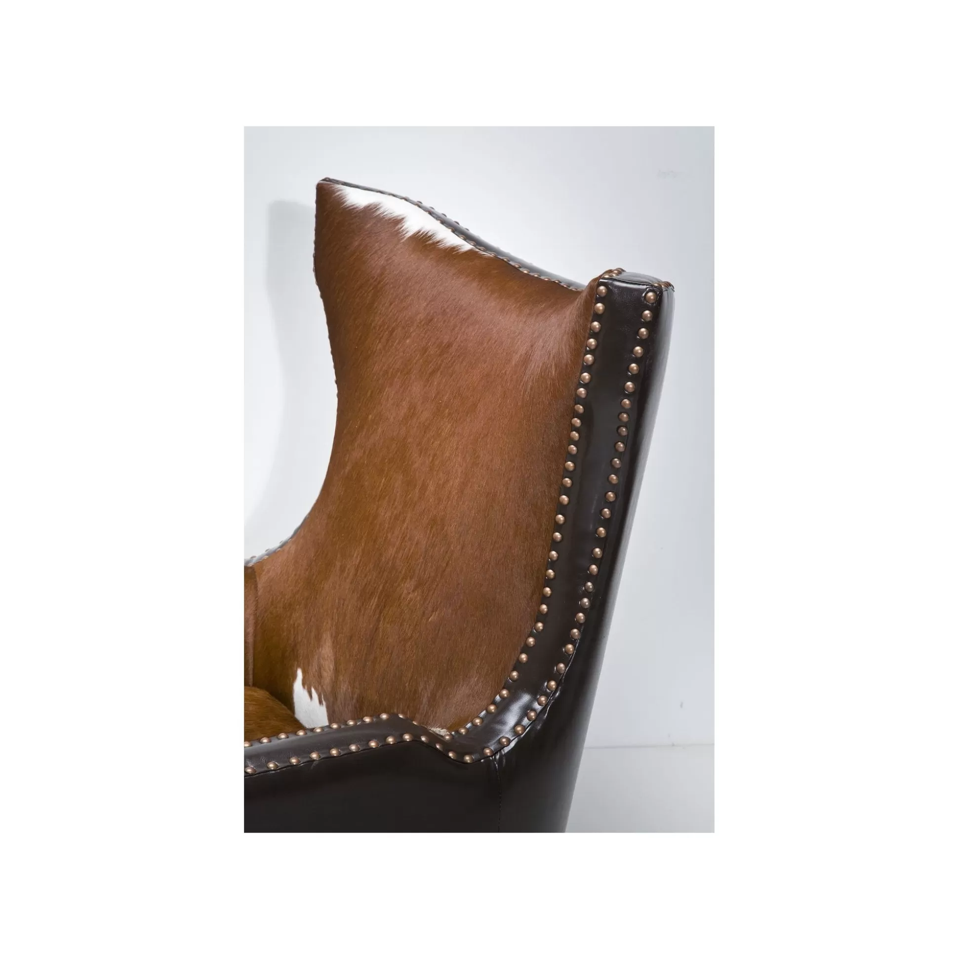 Voici un fauteuil à oreilles atypique qui capte l’attention ! Entièrement recouvert de peau de vache, ce fauteuil confortable rappelle la chaleur d’un chalet de montagne et donne envie de se détendre au coin du feu. L’alliance de la peau de vache et du cuir marron foncé en font une pièce d’exception très tendance. Les rivets tout autour des accoudoirs et du dossier apportent une pointe de moderne à ce fauteuil bergère.