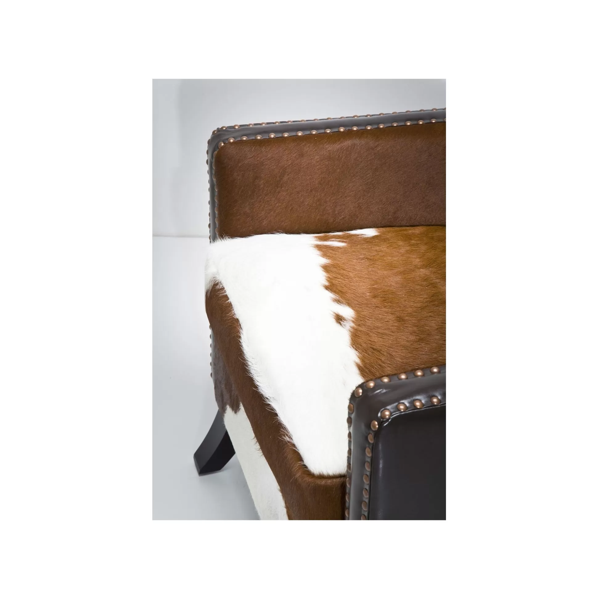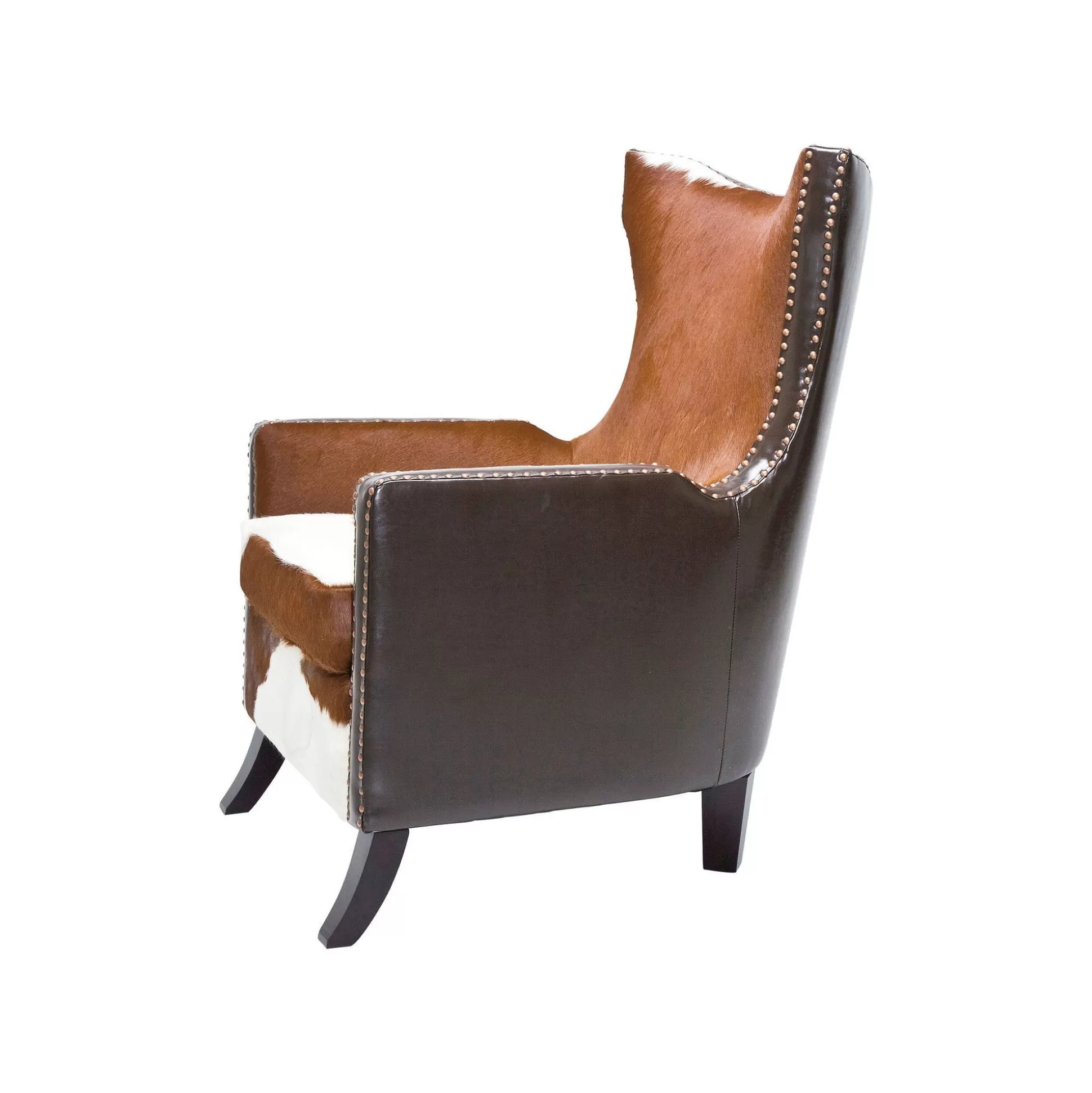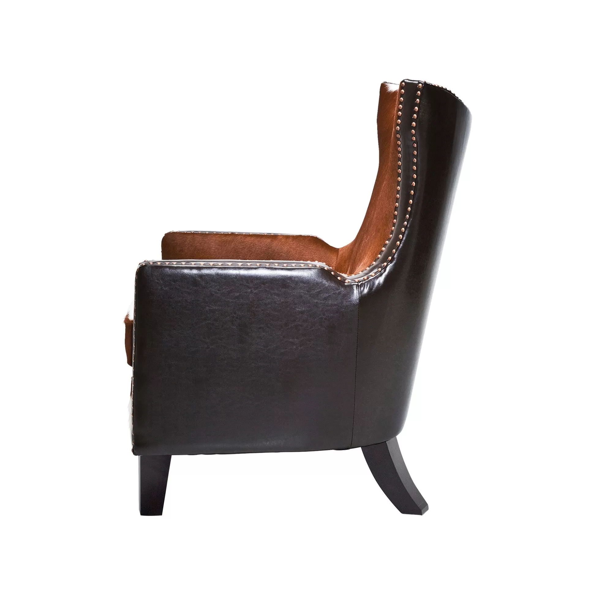 Voici un fauteuil à oreilles atypique qui capte l’attention ! Entièrement recouvert de peau de vache, ce fauteuil confortable rappelle la chaleur d’un chalet de montagne et donne envie de se détendre au coin du feu. L’alliance de la peau de vache et du cuir marron foncé en font une pièce d’exception très tendance. Les rivets tout autour des accoudoirs et du dossier apportent une pointe de moderne à ce fauteuil bergère.