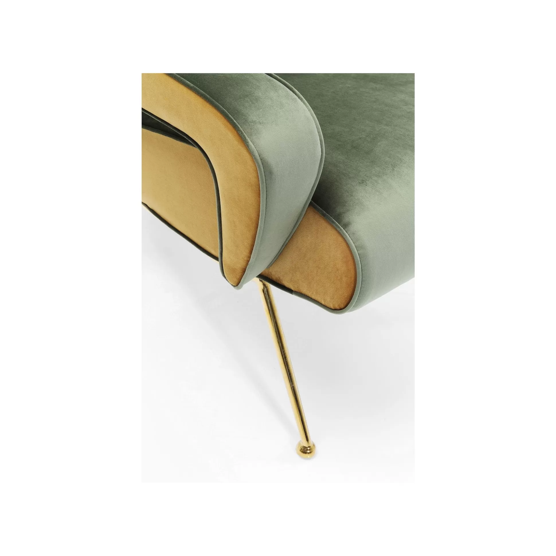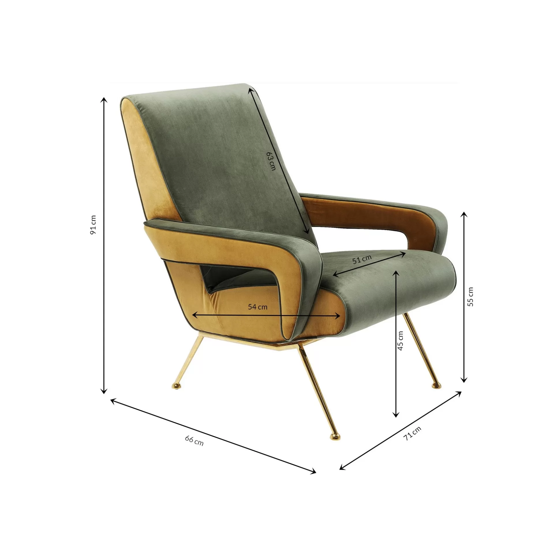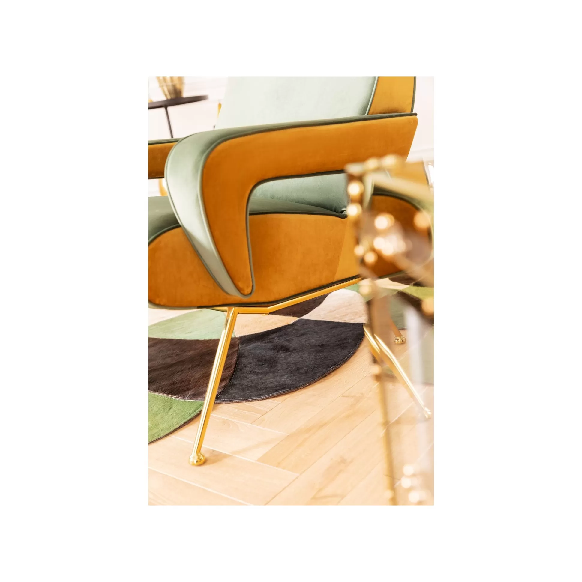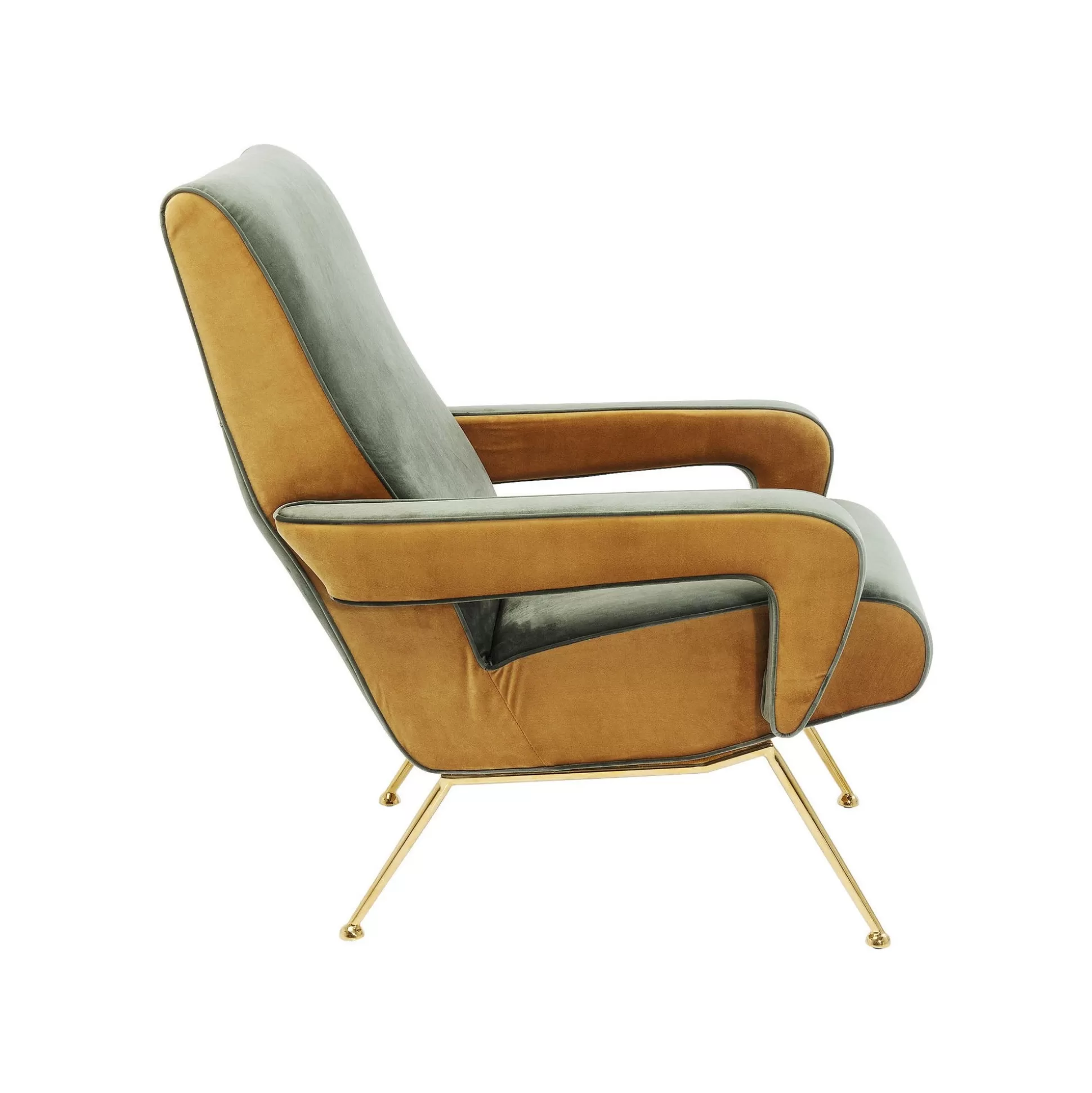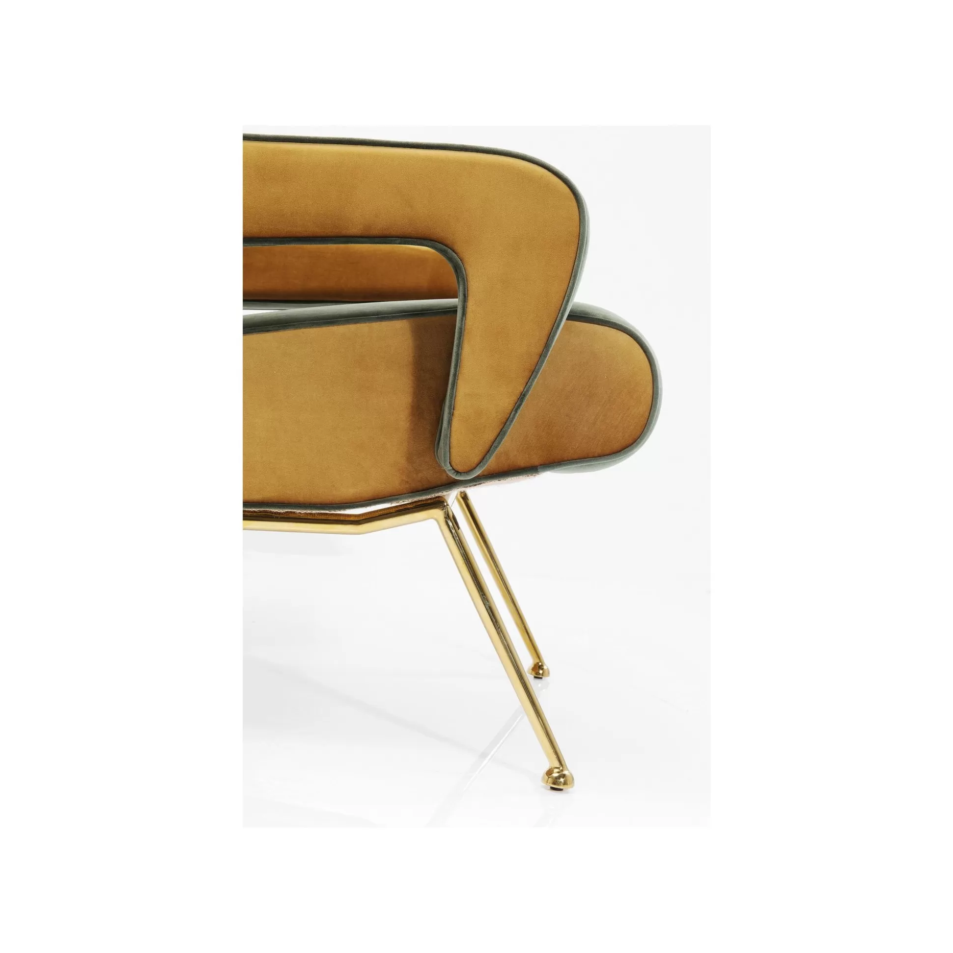 Ce fauteuil s’inscrit dans une esthétique rétro avec son assise en tissu velours soulignée par un profil jaune moutarde et des pieds en acier finition laiton aux extrémités rondes. Ses couleurs chaudes apportent une touche de lumière à votre pièce, à compléter avec une table basse dorée par exemple.