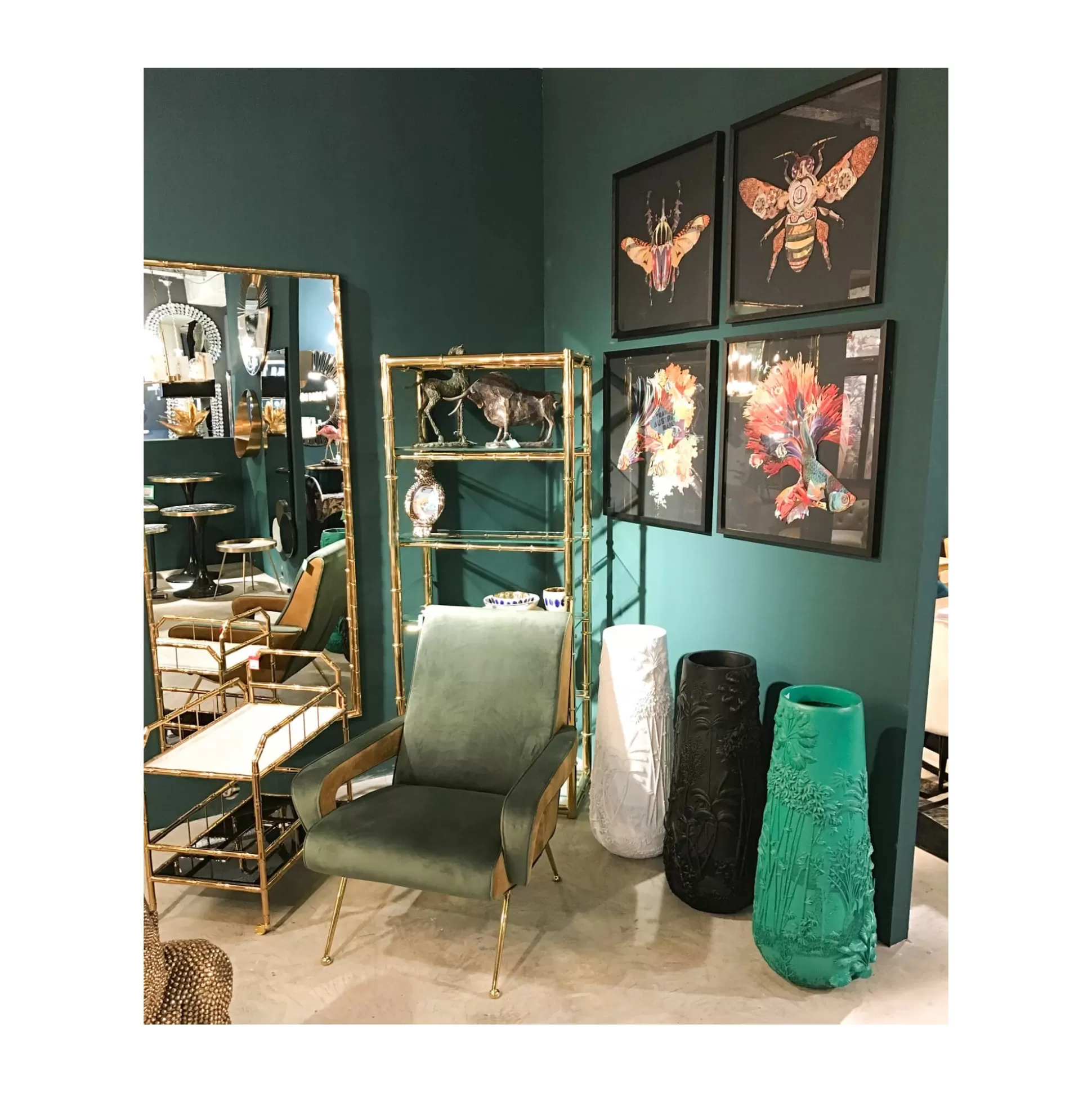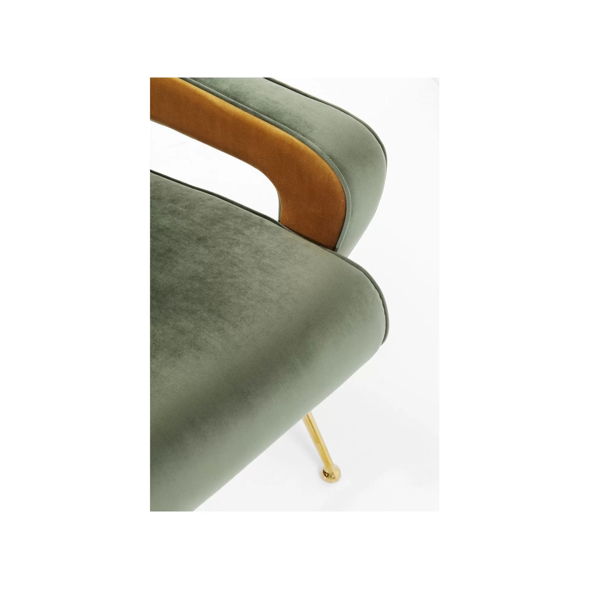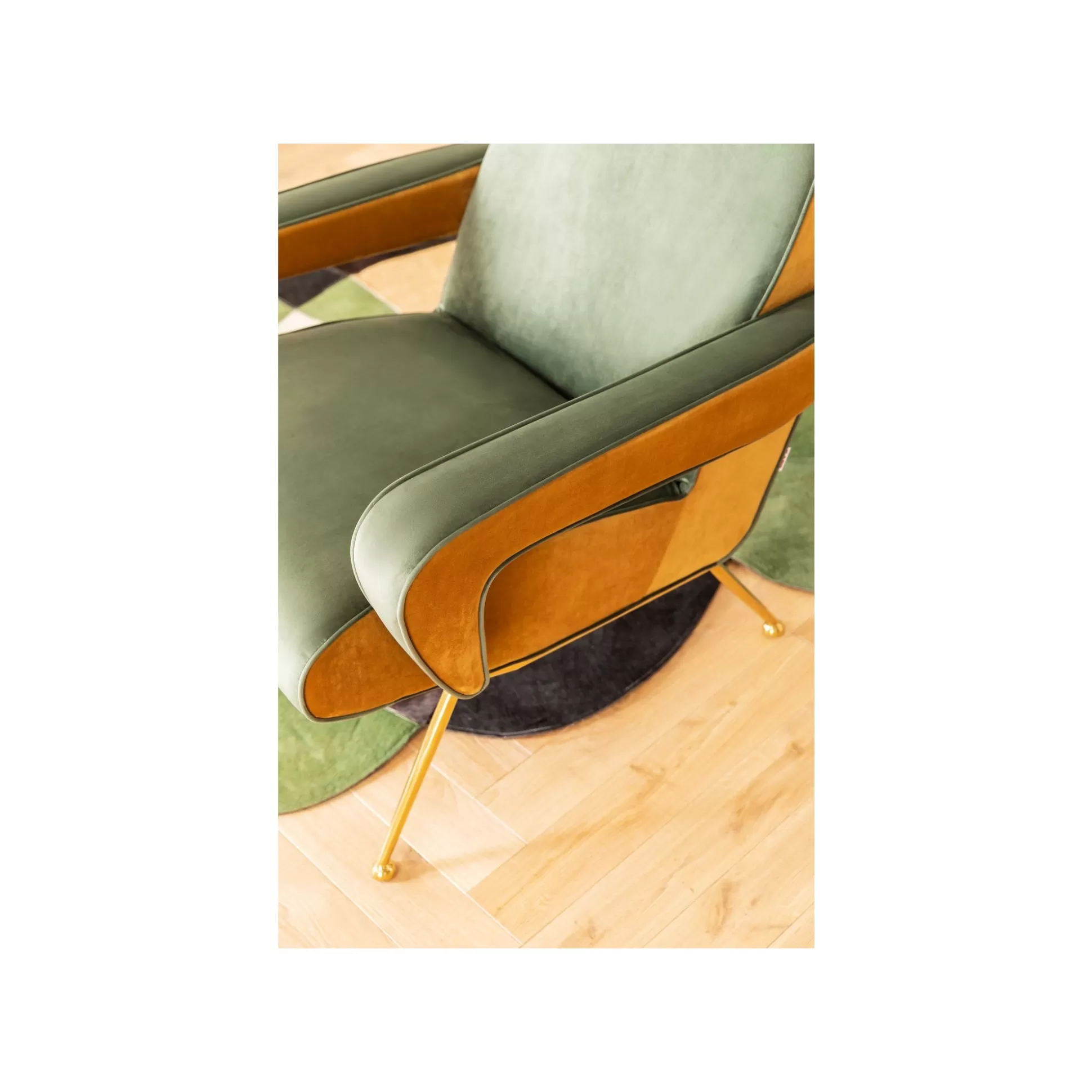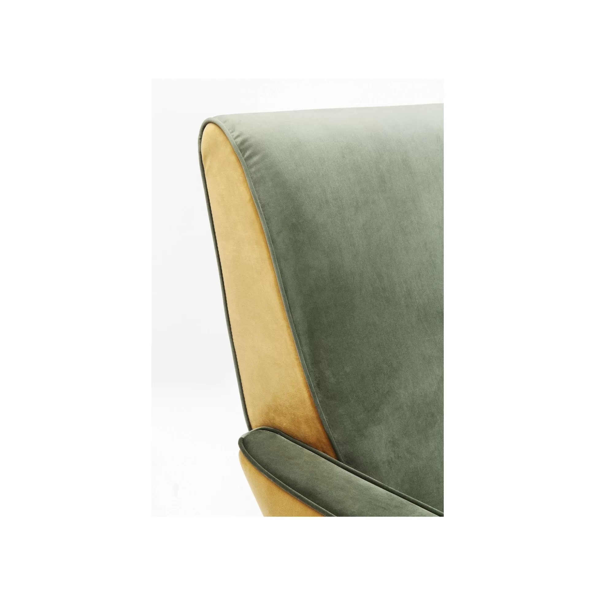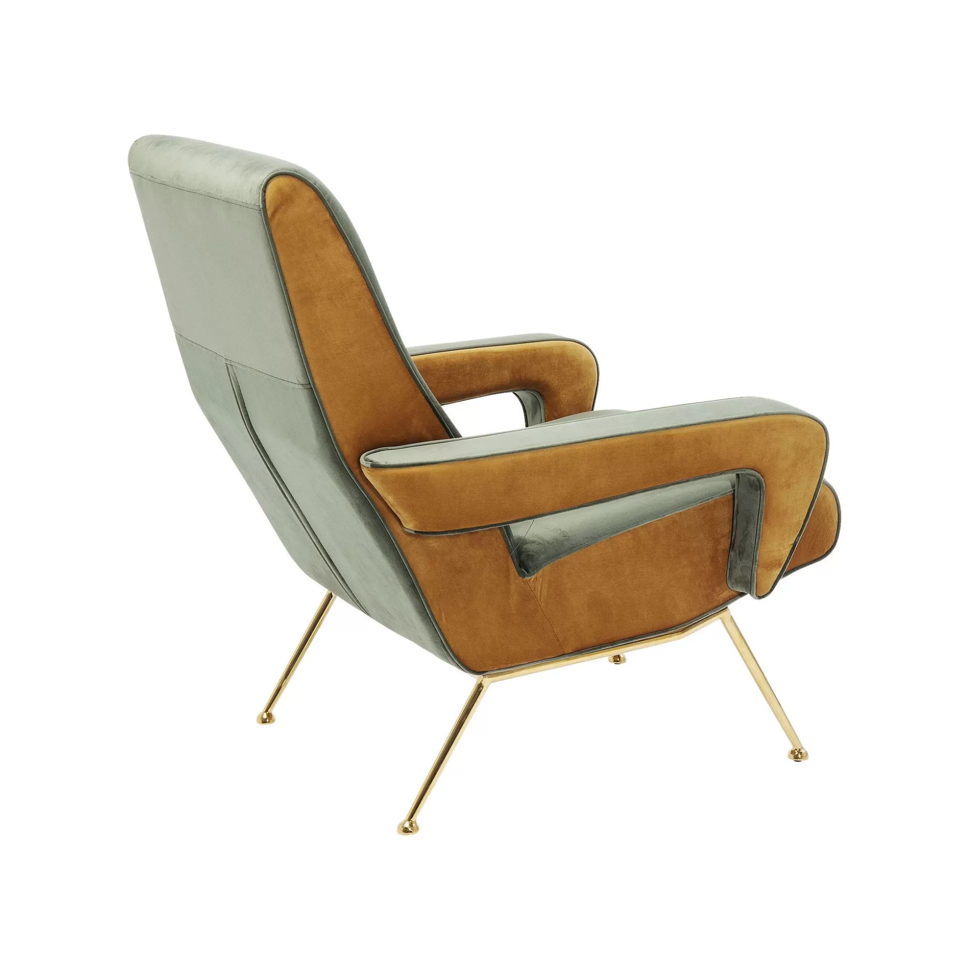 Ce fauteuil s’inscrit dans une esthétique rétro avec son assise en tissu velours soulignée par un profil jaune moutarde et des pieds en acier finition laiton aux extrémités rondes. Ses couleurs chaudes apportent une touche de lumière à votre pièce, à compléter avec une table basse dorée par exemple.