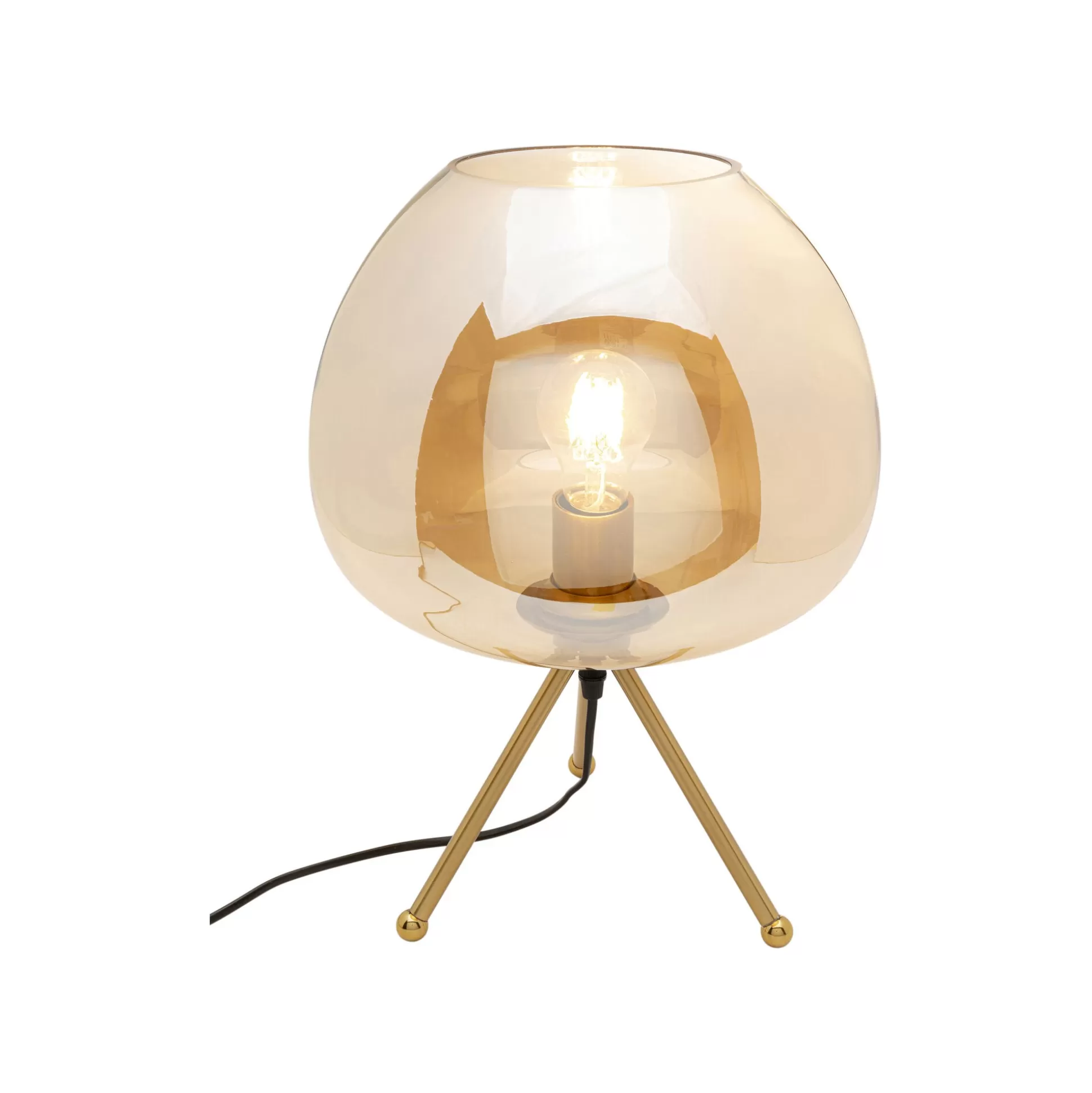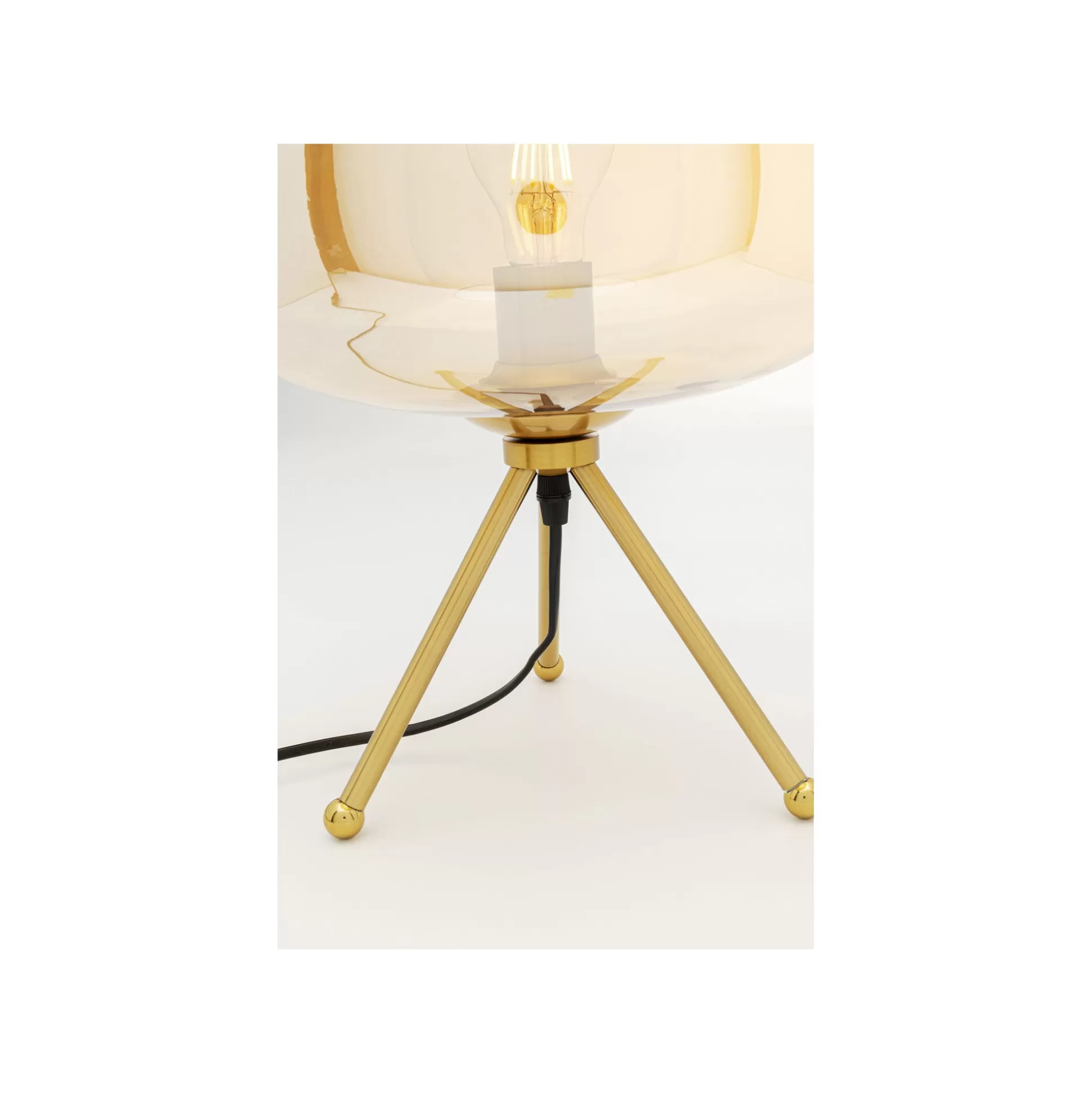 Illuminez votre espace avec cette lampe rétro. Elle se distingue par ses trois pieds dorés et son abat-jour en verre ambré qui diffuse une lumière chaleureuse.