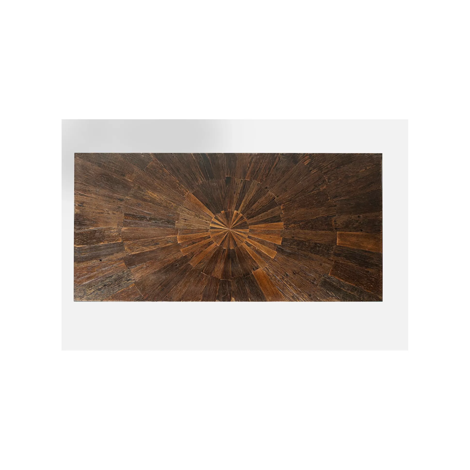 Optez pour une table éco-responsable dont chaque modèle est unique : le plateau de ce meuble est en effet composé de morceaux de bois recyclés disposés à la main. Rayons, spirales, étoiles : chacun est libre de tirer sa propre interprétation des empiècements qui rappellent les techniques de mosaïques. Complimentée par un plateau en verre et des pieds en acier brut, cette table offre une ambiance tendance.